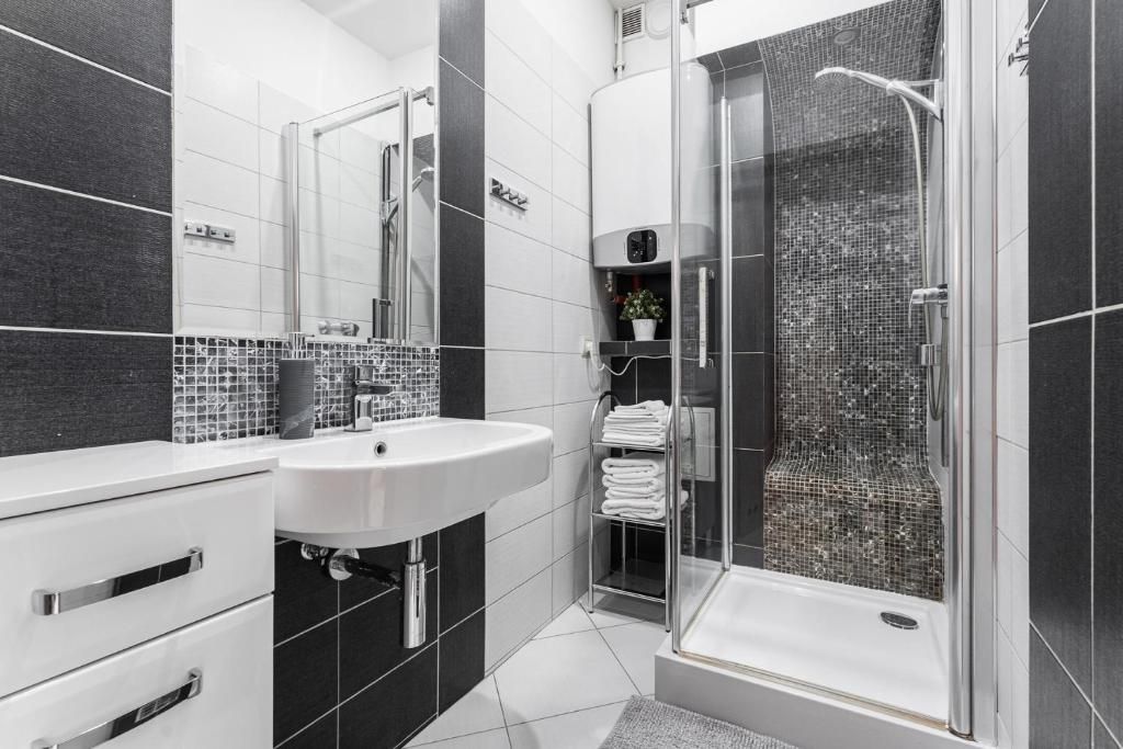 Łazienka z kabiną prysznicową; w apartamencie znajduje się także pralka, suszarka do włosów, ręczniki i podstawowe kosmetyki.